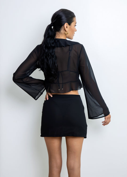 La Michaux black sheer luxury ruffle top with long sleeves, back view #color_black
