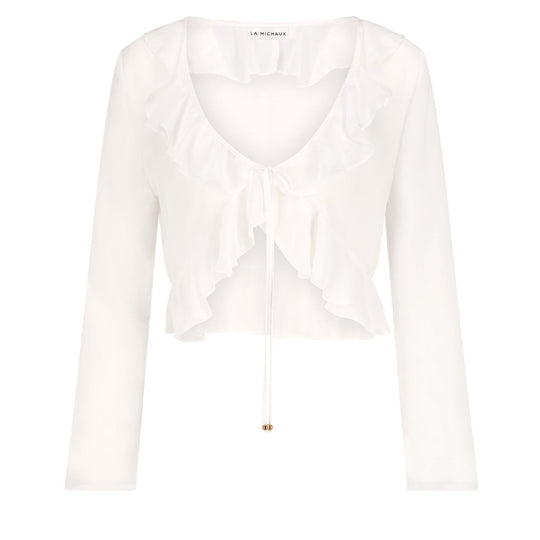 La Michaux white sheer luxury ruffle top with long sleeves, front view #color_white