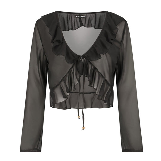 La Michaux black sheer luxury ruffle top with long sleeves, front view #color_black