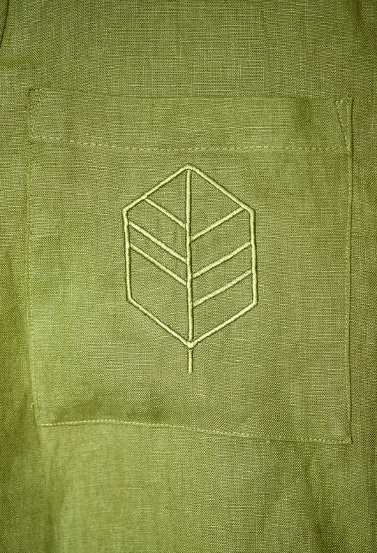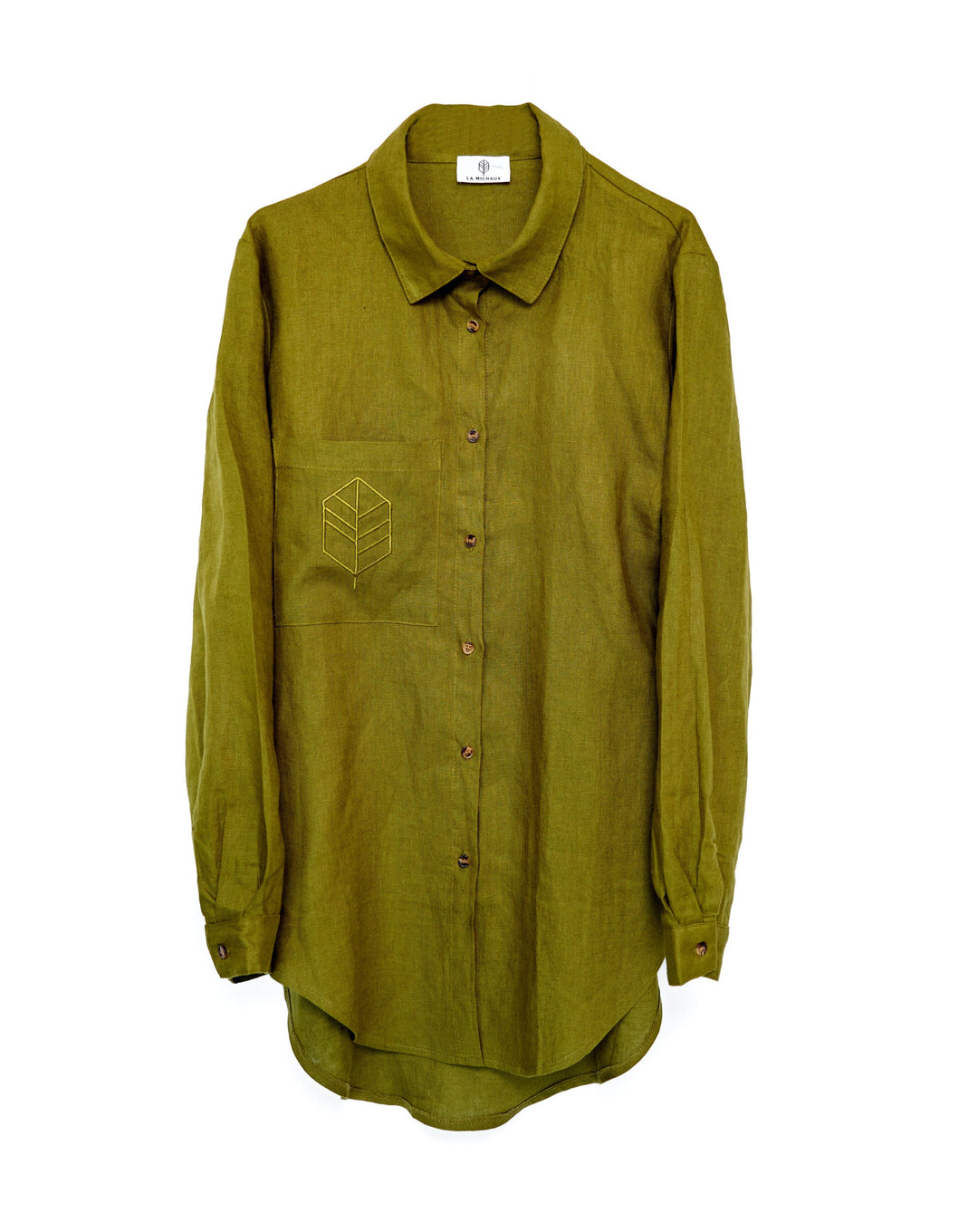 Khaki linen shirt with custom La Michaux embroidery logo