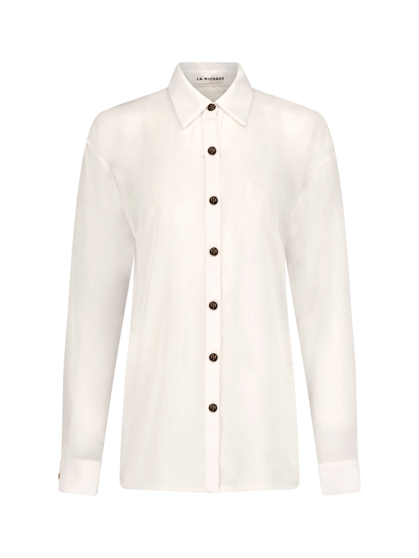 La Michaux White sheer Shirt with gold buttons, long sleeves, classic collar, luxury resortwear for women #color_white